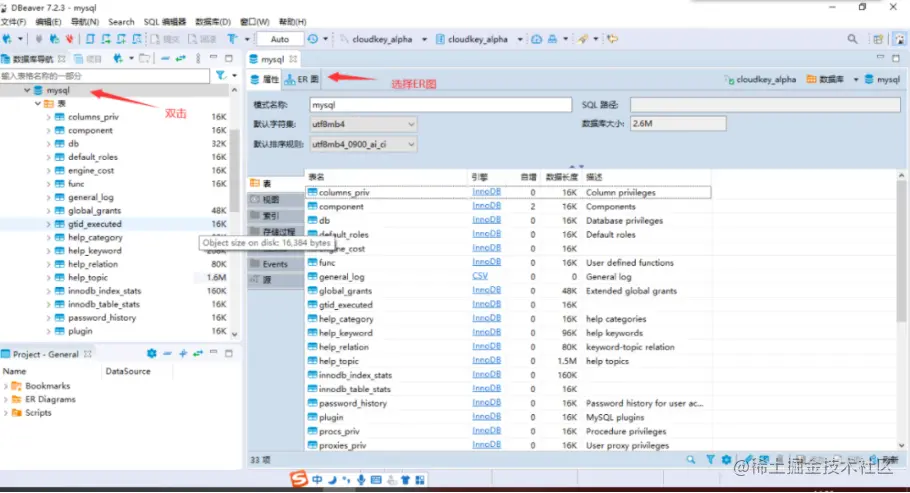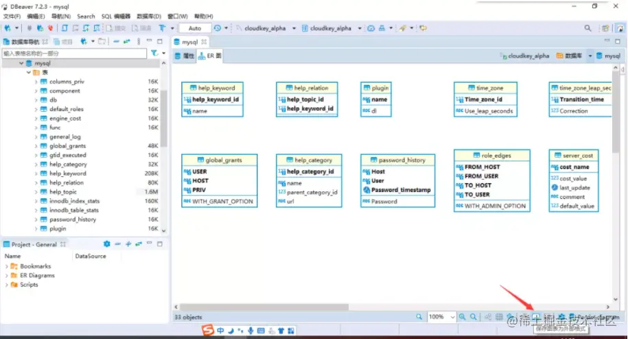 DBeaver生成ER图也很简单,双机目标数据库,右边窗口会新建一个tab,展示数据库表及生成ER图选项。