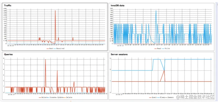 DBeaver还支持对数据库的监控,不管是线上环境还是开发环境,这都是极其有用的一个功能。打开监控面板的方法也很简单,选中数据库-右键-工具-Open DashBoard。监控的内容包括数据库流量、数据读写、数据查询次数、会话数等。(不同的数据库监控的内容不一样,这里以MySQL为例)