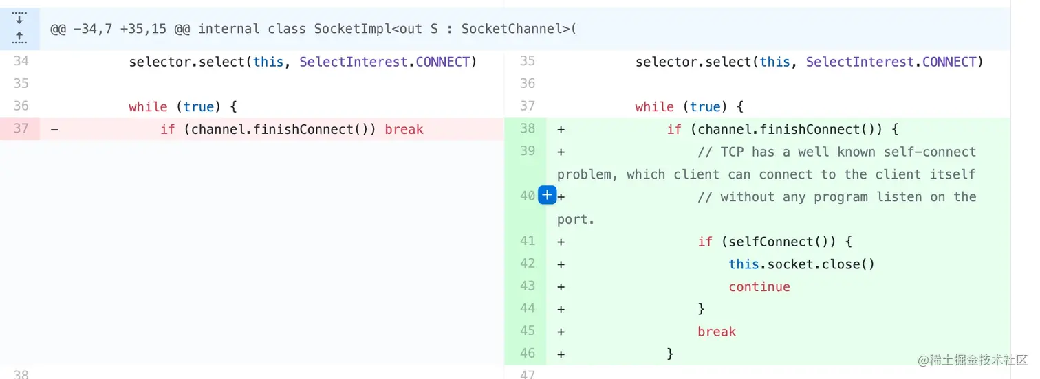 这个问题不是 Kotlin 或者 Java 特有的,我在 Golang 的源码时早期的 connect 的代码也有这个问题,不过后面有人提了 issue 修复了,代码如下所示。