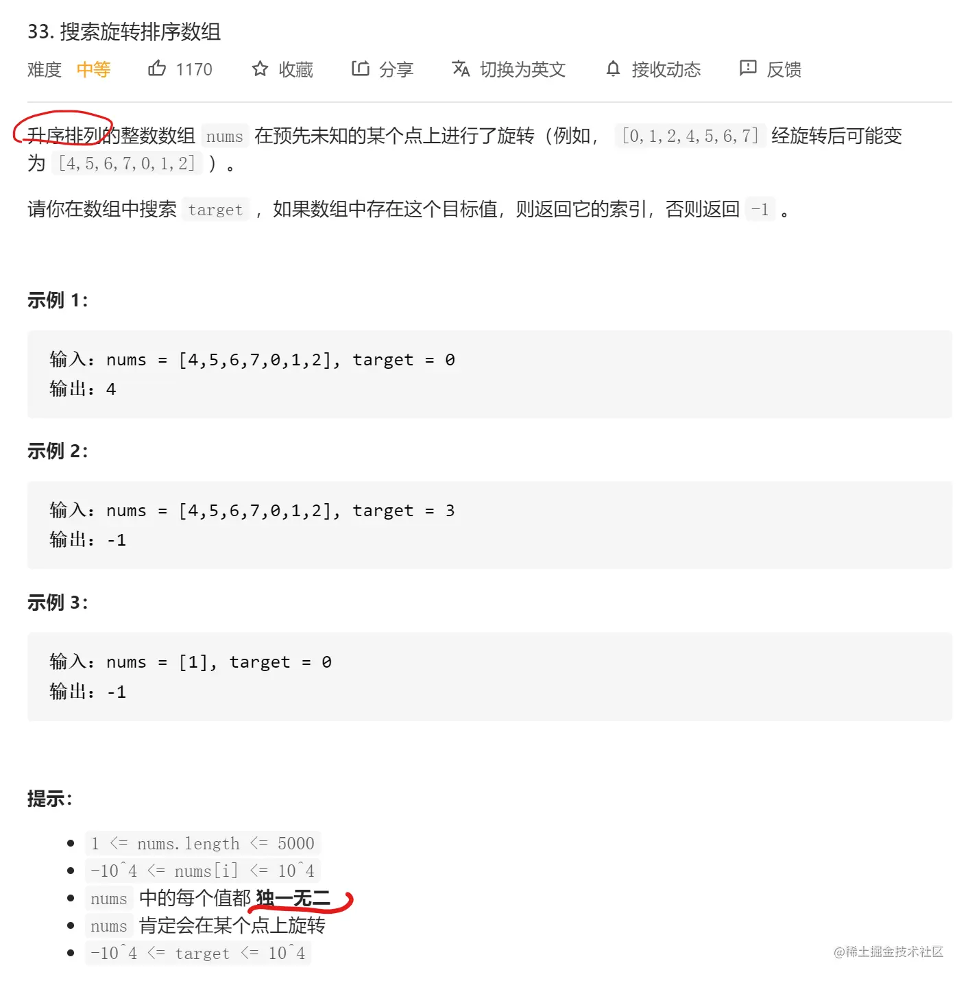 O(logN)的时间复杂度。 - “旋转”的意思是按照顺序从nums的头部抽出几个元素然后按照顺序插到nums的尾部,因此旋转后的数组是两个升序子数组构成的。