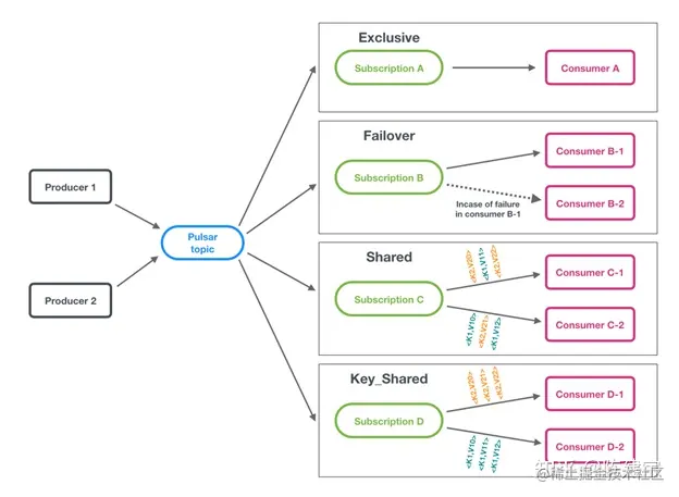 pulsar的主题订阅模式包括四种:独占(exclusive)、共享(shared)、灾备(failover)、key共享(key_shared)。