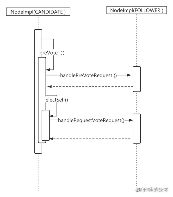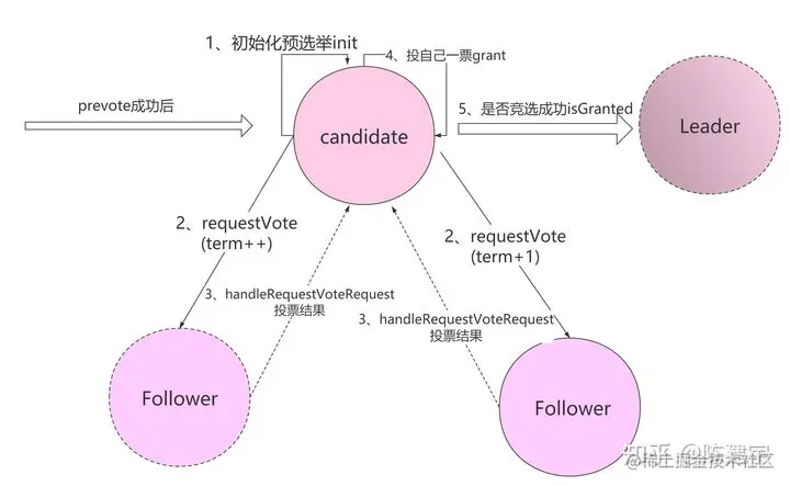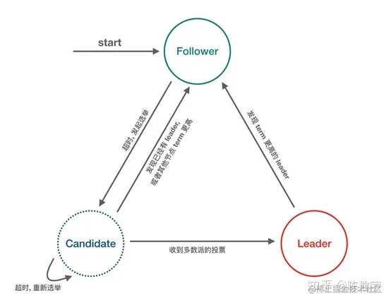 Candidate:用来竞选一个新leader(candidate 由 follower 触发超时而来)