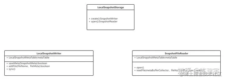 StateMachine:业务系统定义,生成具体快照文件,通过SnapshotWriter记录快照文件名,及其元数据信息