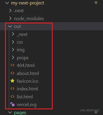 执行命令 npm run export,进行构建和导出操作,生成 out 文件夹,获取静态站点资源。