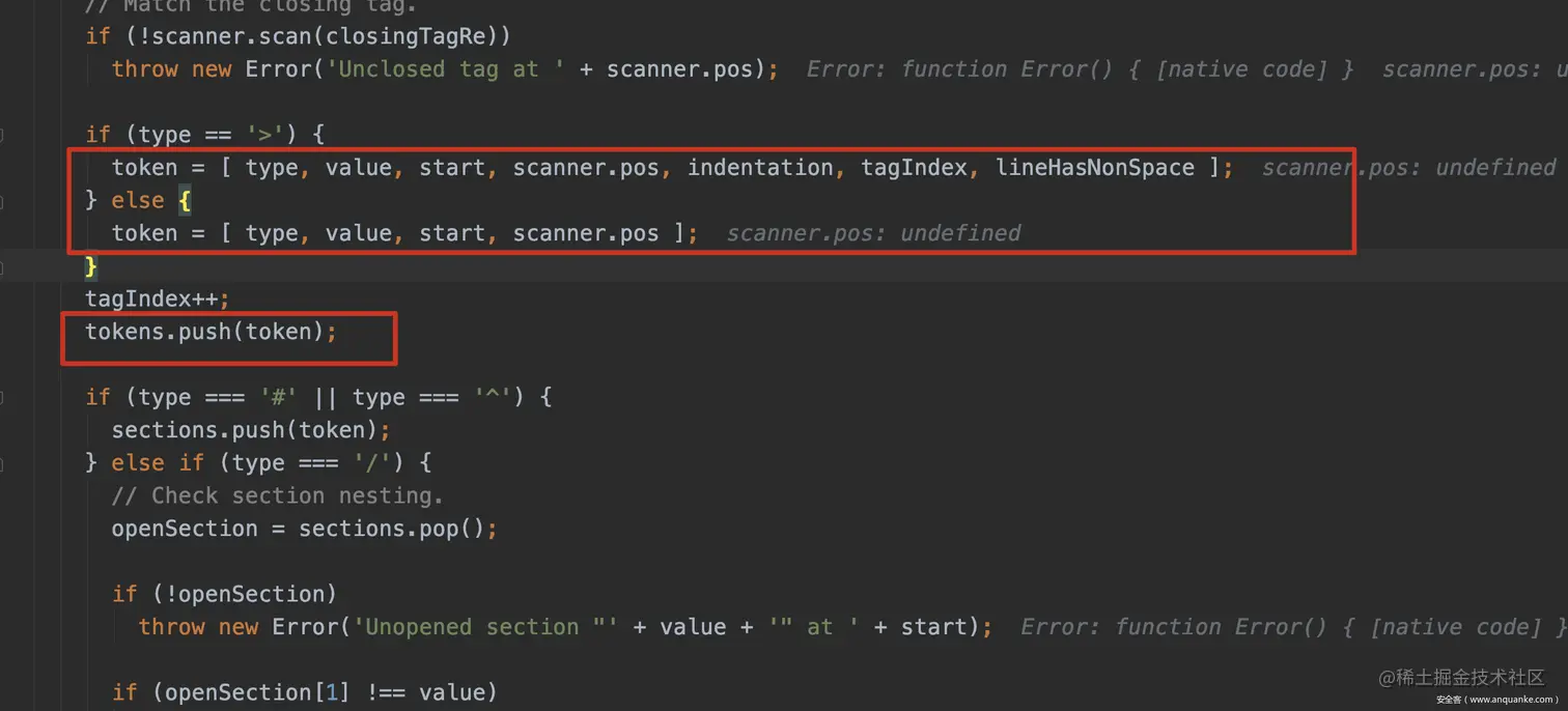 Mustache相应的定位代码如下,其中scanner负责对模板字符串进行扫描,扫描的结果为会存入多个token对象中。