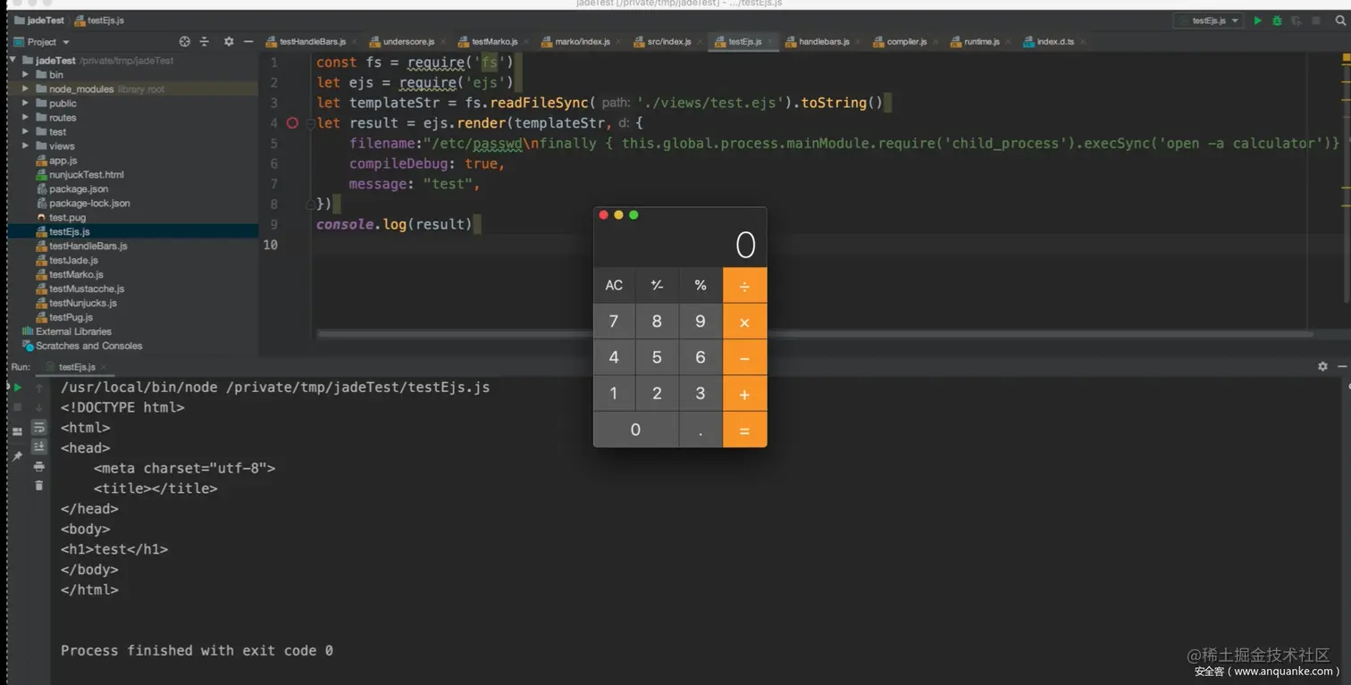 在本次的分析中,无恒实验室主要对Mustache和ejs两种引擎的渲染机制进行阐述,其他引擎的渲染过程大致相同。