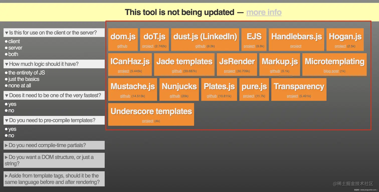目前JavaScript生态圈里面的模板引擎非常之多,各引擎的实现原理及特性都不尽相同,很难找到一款功能丰富、书写简单、前后端共用的模板引擎,因此有开发者设立了一个根据不同需求挑选不同引擎的网站garann.github.io/template-chooser。