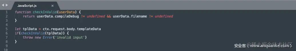 - ○ 若需要直接获取用户数据进行模板渲染,确保用户数据中不存在compileDebug和filename选项或者这些选项的值不可控。可采用如下的安全检测函数。