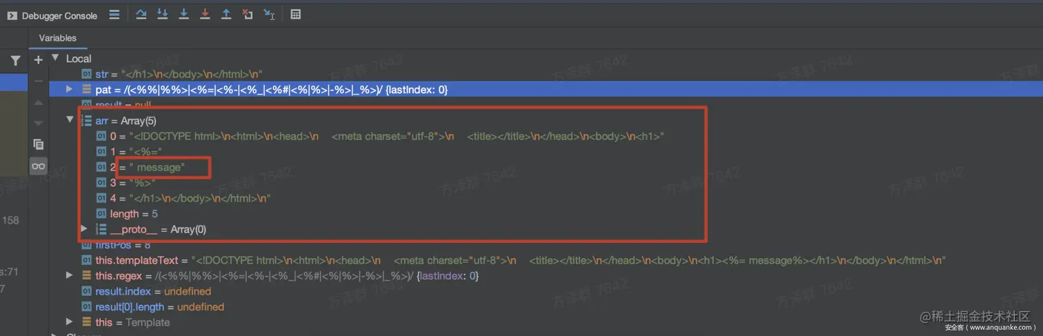 最终分割示例模板字符串的结果如下所示,可以看到要被替换的数据message已经被定位出来了。