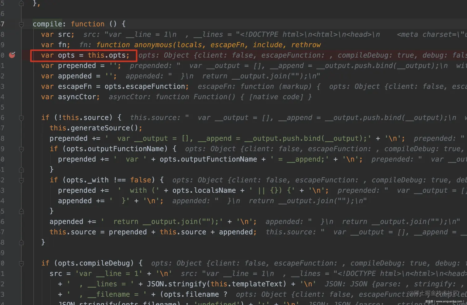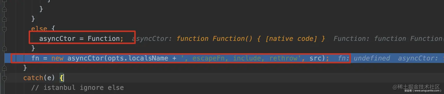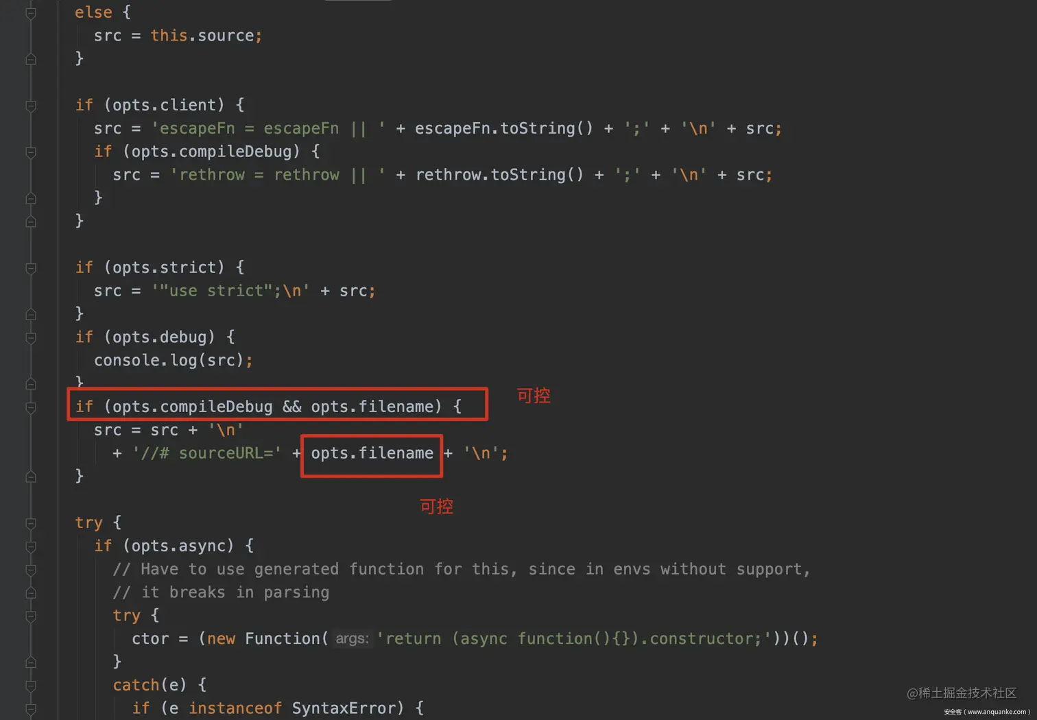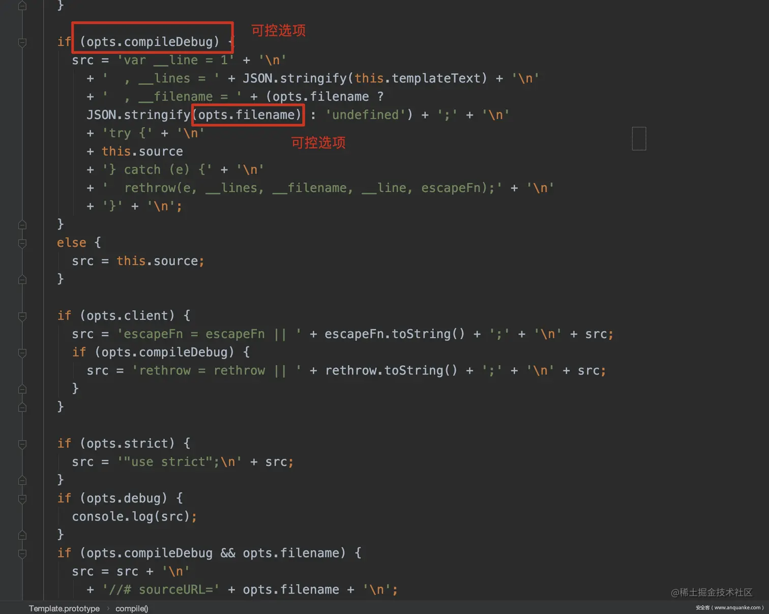 接下来继续跟进,可以看到在如下的代码中,compileDebug和filename都是我们可控的,并且最后filename也被直接拼接进匿名函数的代码中,因此在这里就可以通过控制filename选项注入恶意的代码。