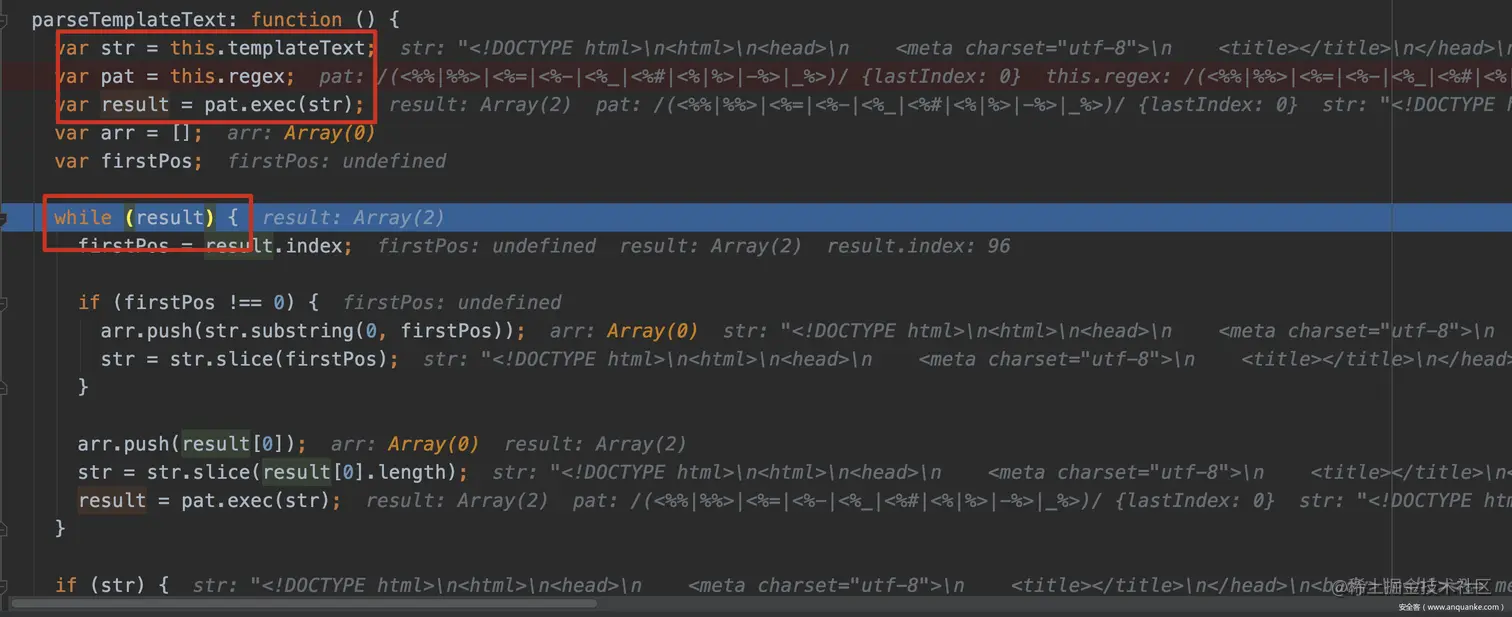 ejs会调用parsteTemplateText函数进行定位,其中this.templateText为原始的模板字符串,this.regex为指定的特殊符号(也就是ejs指定的'<%'、'%>'等),接下来则会通过while循环不断匹配将原始模板字符串分割。