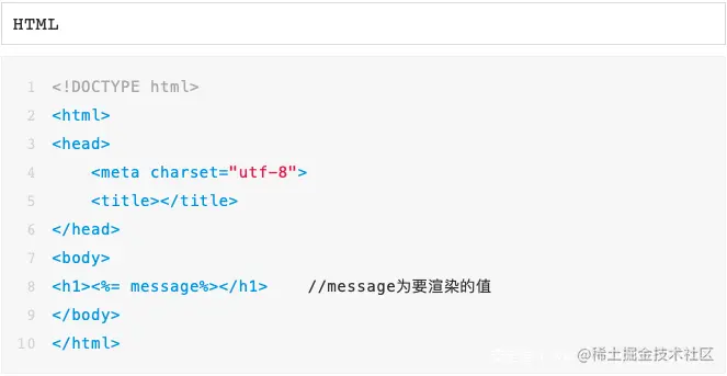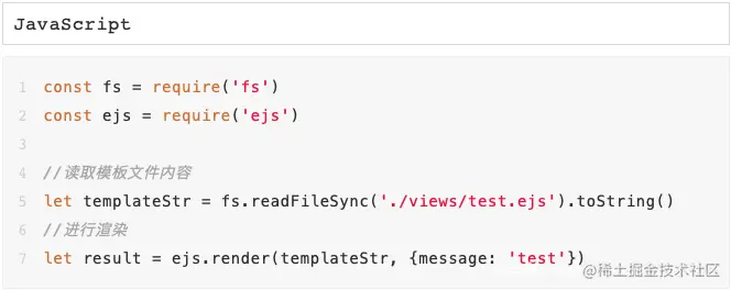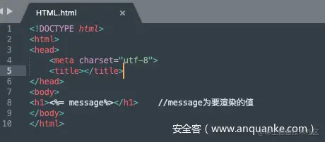 以下面的ejs渲染代码为例,“./views/index.ejs”为模板文件的位置,{message: 'test'}为要渲染进模板中的数据:
