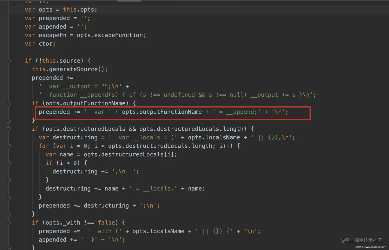 那么这些可污染选项,能对匿名函数代码的生成造成什么影响呢?继续跟进渲染引擎发现,匿名函数代码在动态生成的过程中,由三部分构成,分别是prepended, this.source, append三部分,而这三个部分的代码又受到了渲染选项的影响
