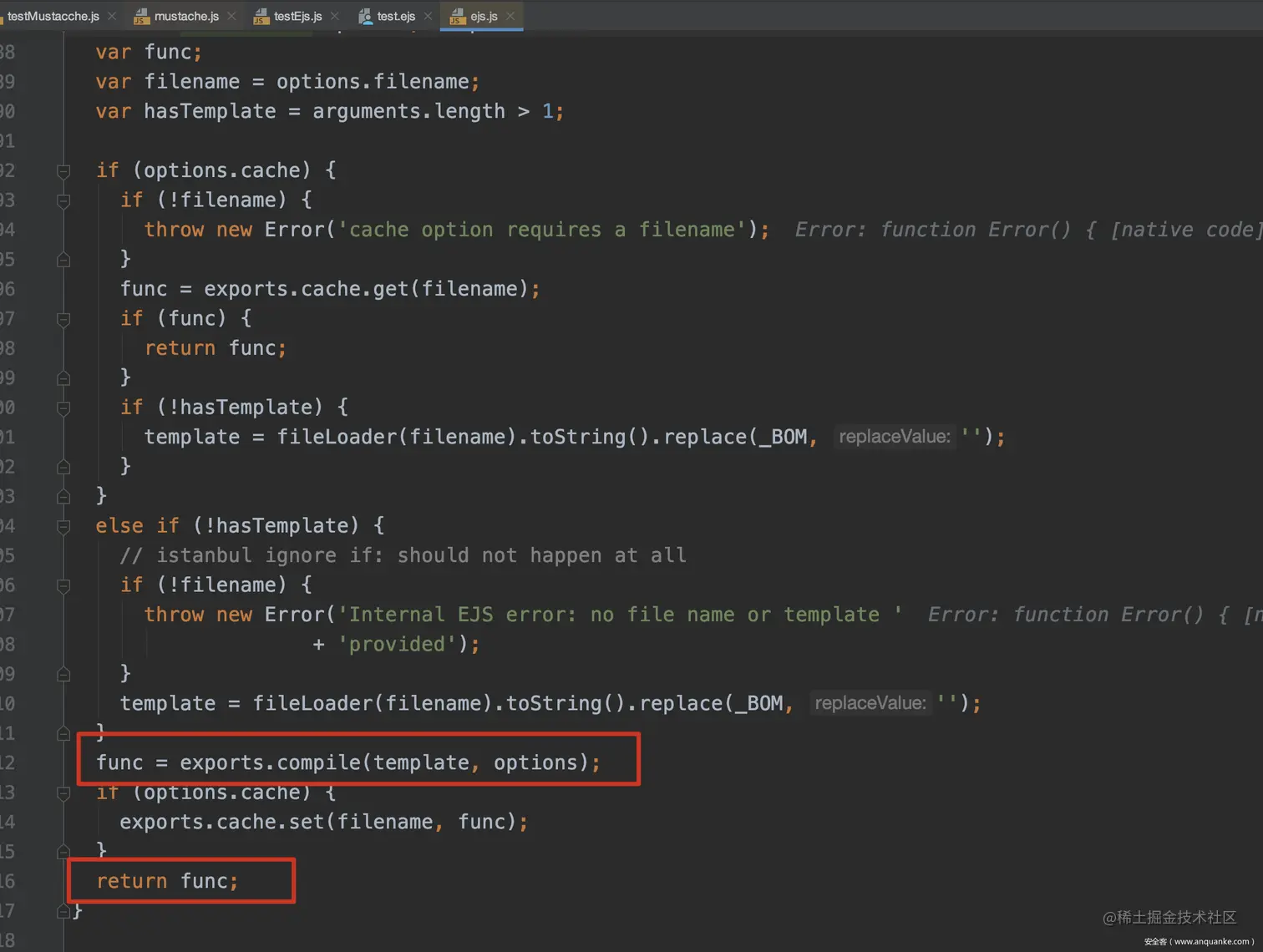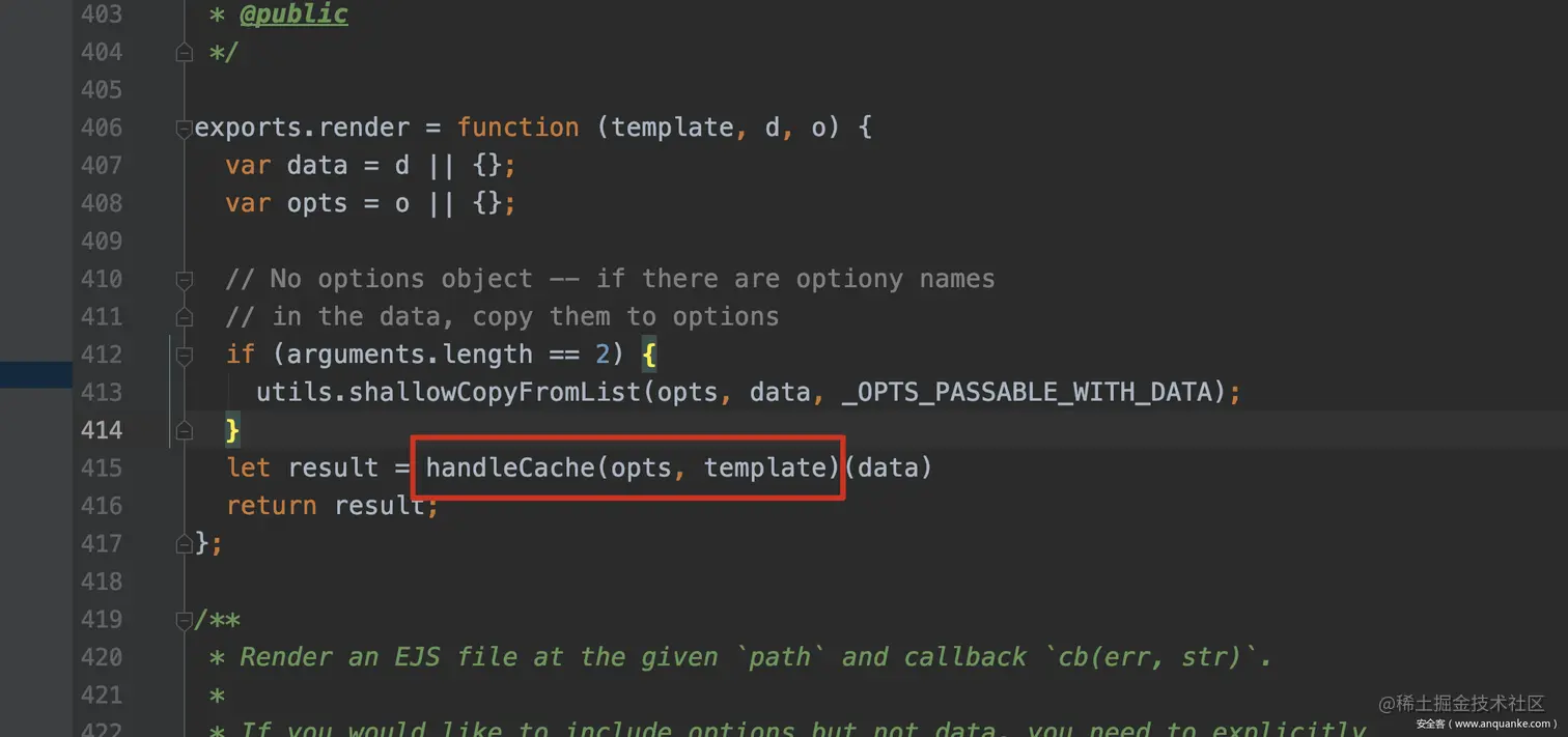 Pug, Nunjucks, ejs等引擎的替换过程就略显麻烦,ejs的render函数中,会先调用handleCache函数。