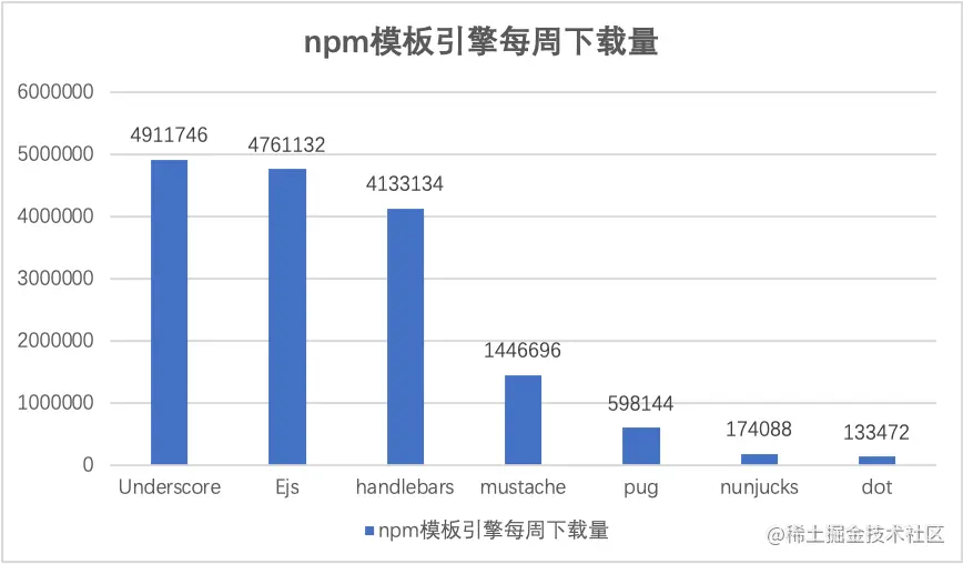 根据npm的官方数据,目前较受欢迎的模板引擎下载量分别如图2所示。无恒实验室根据已有的服务端引擎框架,挑选了目前下载量较大,开发者常用的几种模板引擎进行分析,发现模板引擎的渲染原理基本上都差不多,只是在一些细节的处理方式不太一致。