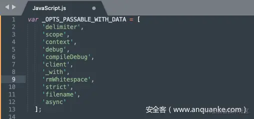 最终这些渲染选项会进入到compile函数也就是匿名函数代码生成的过程中,也就是说,若用户数据能够控制传入的data选项,那么恶意用户就能污染opts中的“delimiter”, “scope”, “context”,“debug”,“compileDebug”, “client”,“_with”,“rmWhitespace”,“strict”,“filename”, “async”。
