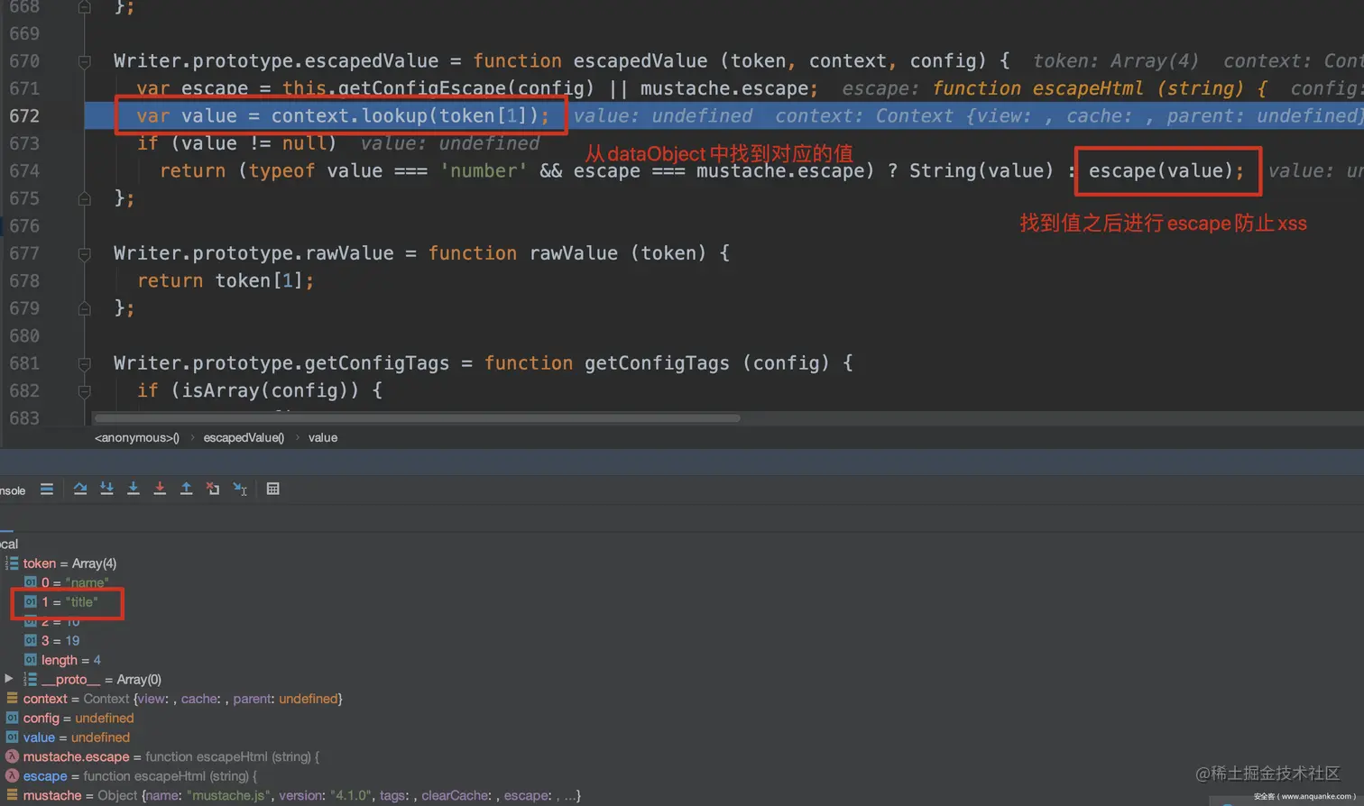 如上所示,如果检测到token为name类型,也就是要被替换的类型,则调用escapedValue函数,该函数中会调用lookup,根据token找到对应的值。
