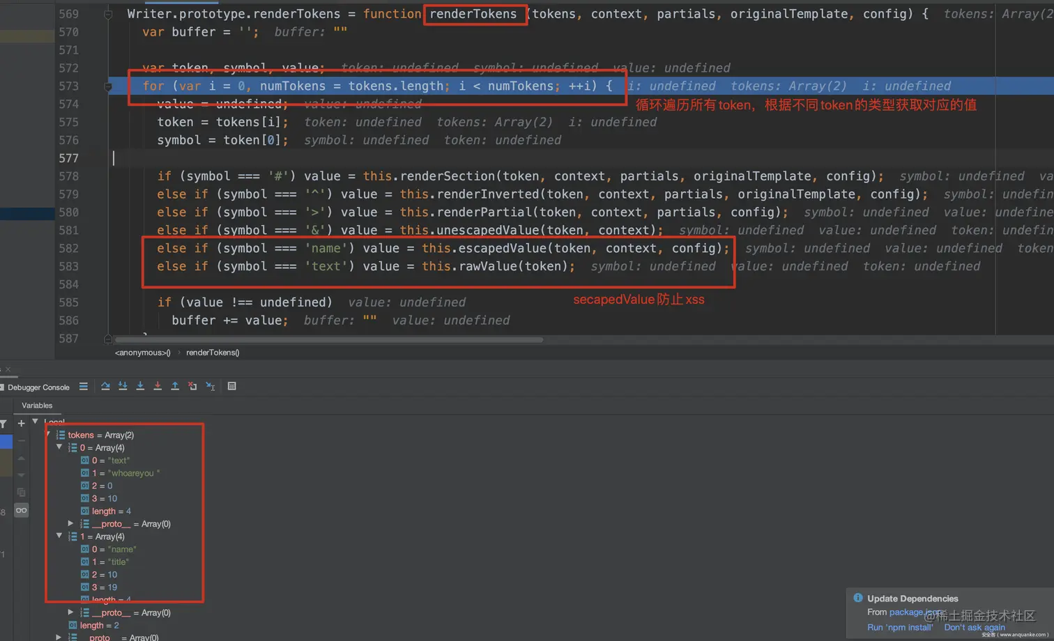 大多数渲染引擎都规定了要被替换的数据必须被某些符号所包裹,比如Mustache默认的符号是 {{ }} ,而ejs默认的符号是<%= %>,因此引擎在工作时,首先要在传入的模板字符串中寻找到这些特殊符号。这一步不同引擎实现方式不同,如Mustache,Nunjucks是通过词法解析也就是采用字符扫描的方式对模板字符串进行扫描,从而定位特殊符号的位置,以如下Mustache的渲染代码为例:
