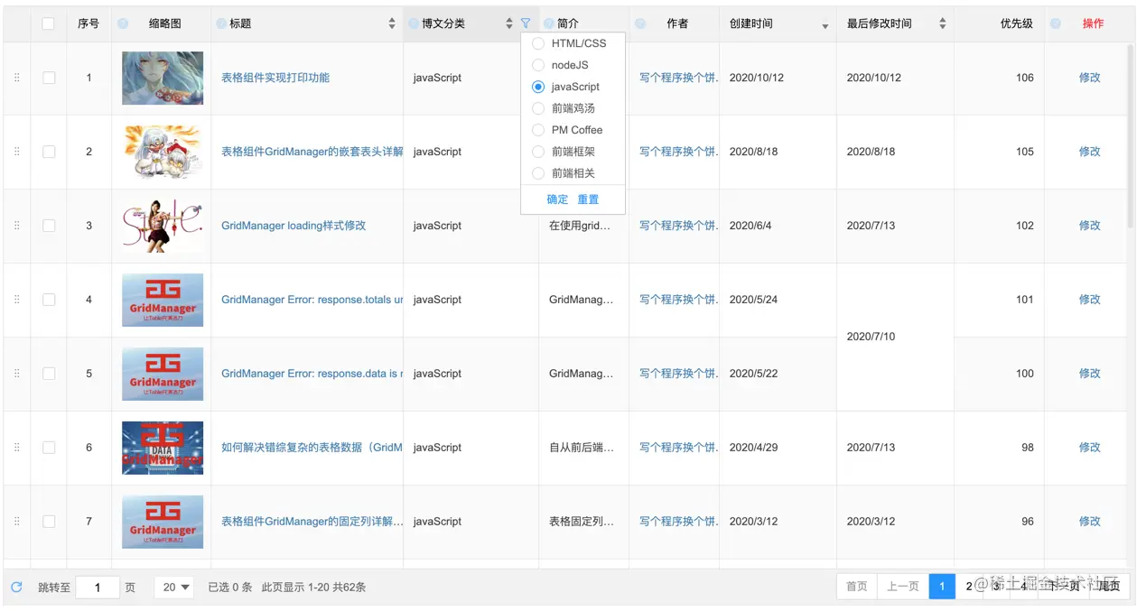 过滤功能在GridManager中被归类于列配置项,所以该功能需要操作关建配置项columnData中的filter。
