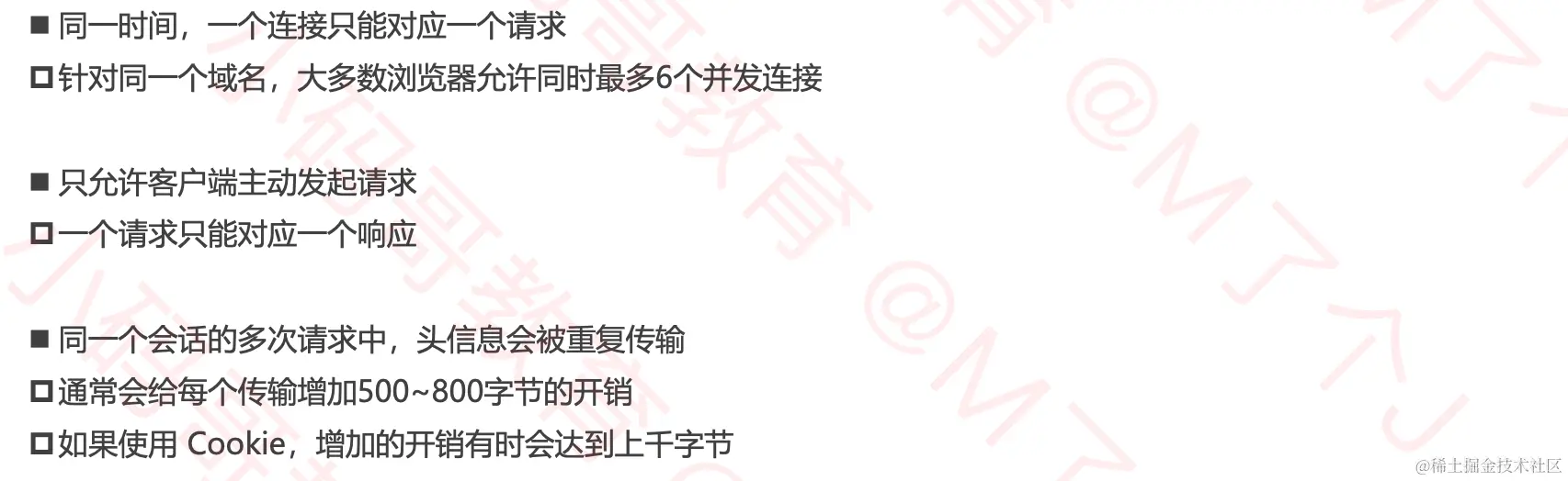 POST、HEAD等请求方法,支持请求头、响应头等,支持更多种数据类型(不再局限于文本数据),浏览器的每次请求都需要跟服务器建立一个TCP连接,请求处理完成后立即断开TCP连接