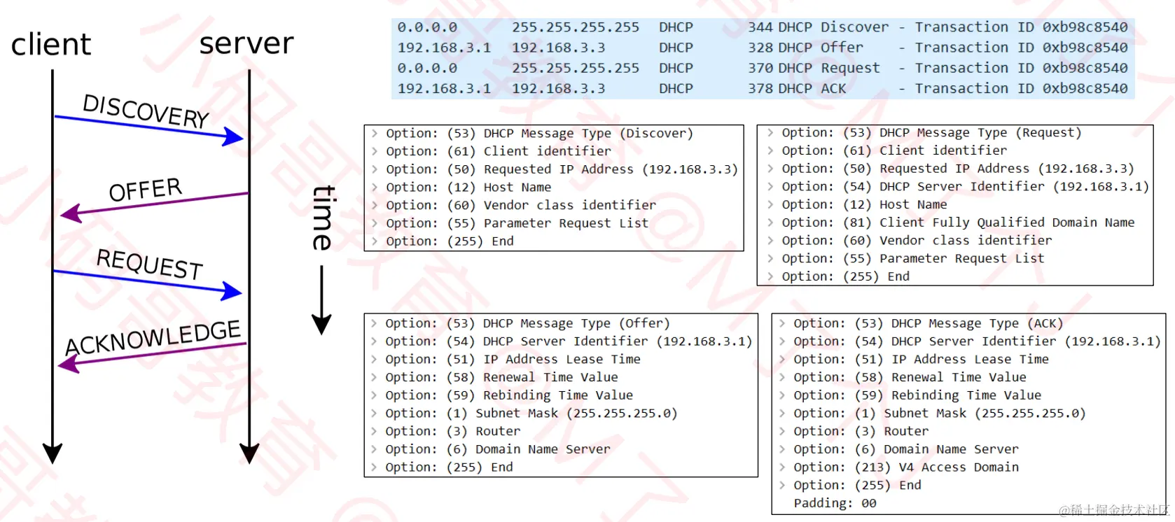 DISCOVER: 发现服务器,发广播包(源IP是0.0.0.0,目标IP是255.255.255.255,目标MAC是FF:FF:FF:FF:FF:FF)