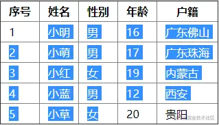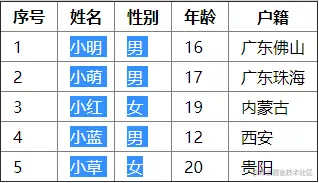 这个需求其实就是excel的列选中,但网页上的table和excel是不一样的,网页选中文字必须要有开始光标和结束位置,tabel和普通段落文字一样,且可选中的块只能有一段,不可以同时选中不连续的两段文字的。如图所示,想要只想选择姓名和性别这两列的文字是做不到的。