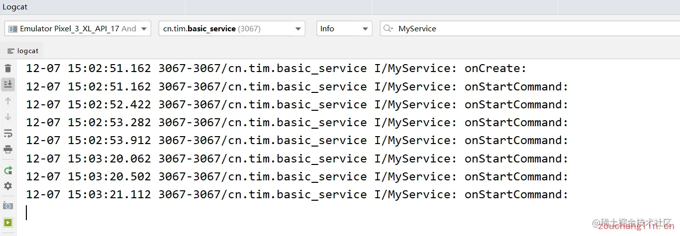 其实 onCreate() 方法是在服务第一次创建的时候调用的,而 onStartCommand() 方法则在每次启动服务的时候都会调用,由于刚才我们是第一次点击 Start Service 按钮,服务此时还未创建过,所以两个方法都会执行,之后如果再连续多点击几次 Start Service 按钮,就只有 onStartCommand() 方法可以得到执行了: