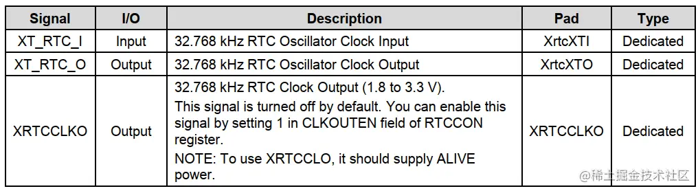 XRTCCLKO 32.768 kHz RTC振荡器时钟输出,此信号默认关闭。可以通过设置寄存器RTCCON的CLKOUTEN字段为1来启用它。