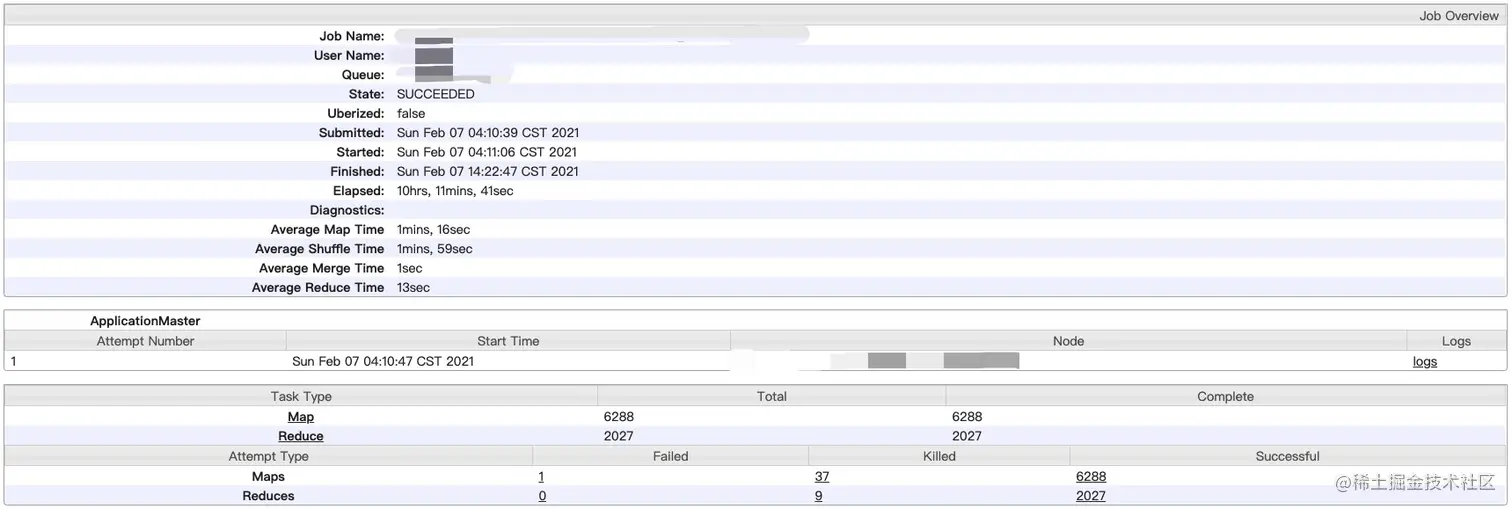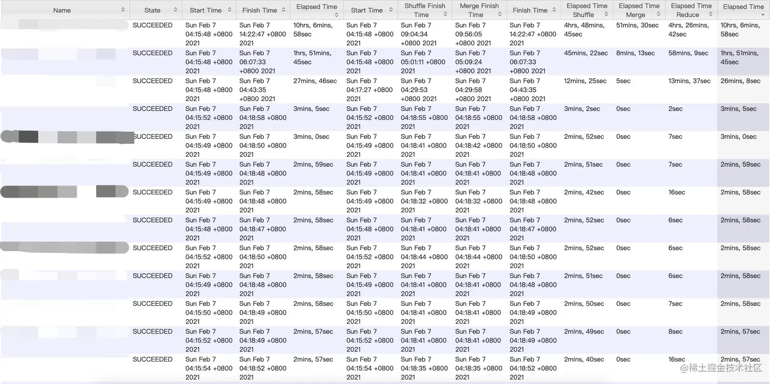 好家伙,有一个Reduce Task执行了10个小时,另个一执行了近2小时,其余Reduce Task的执行时间很短。
