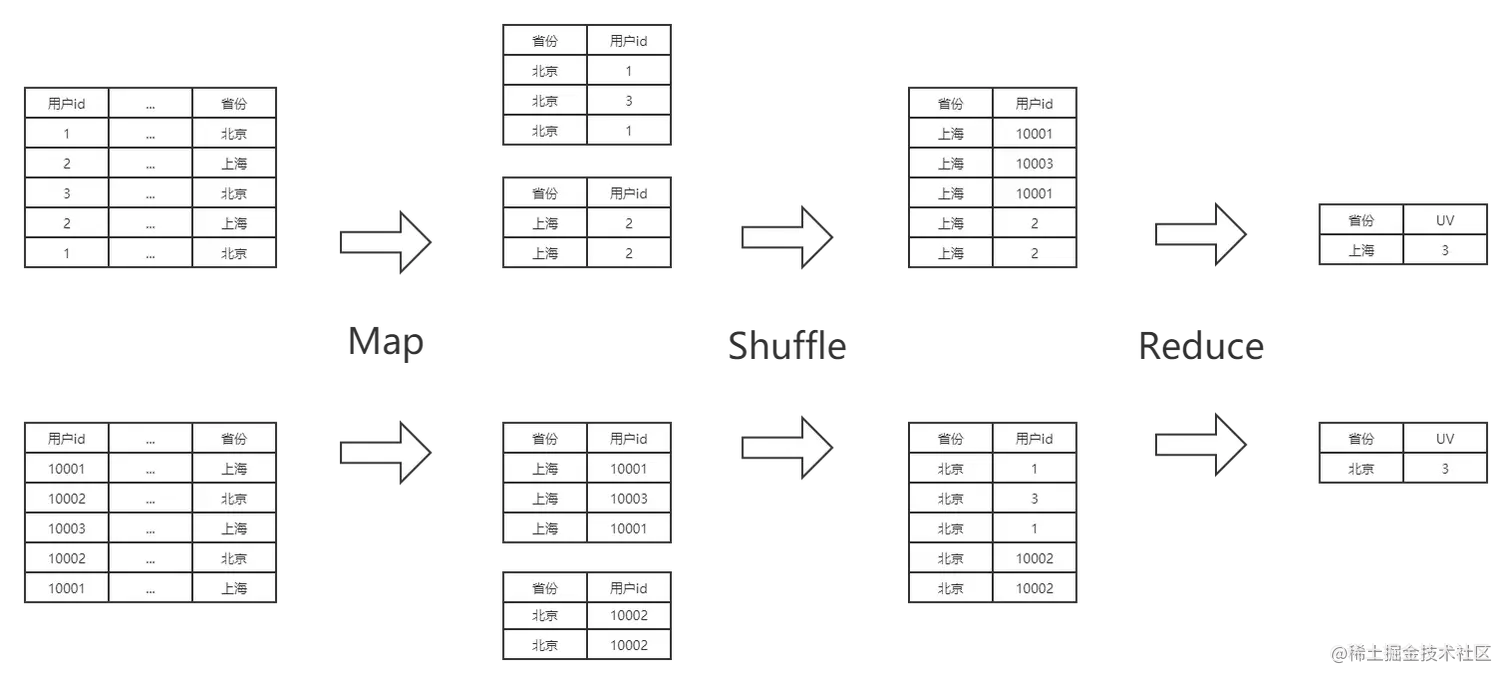 - Reduce阶段:对同一个 province 的 user_id 先去重,再计数