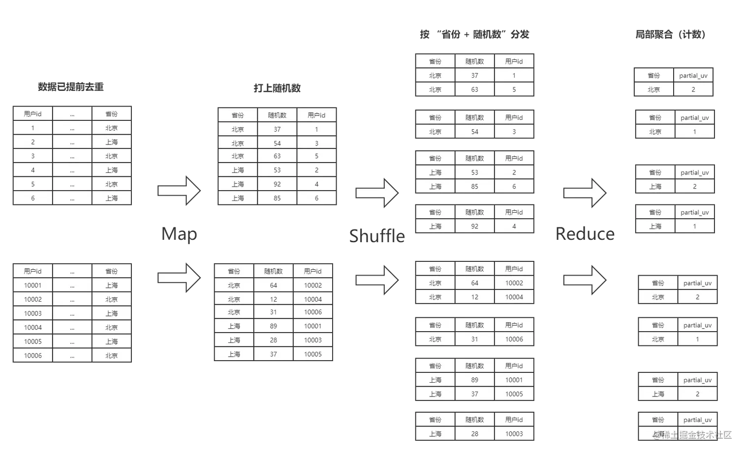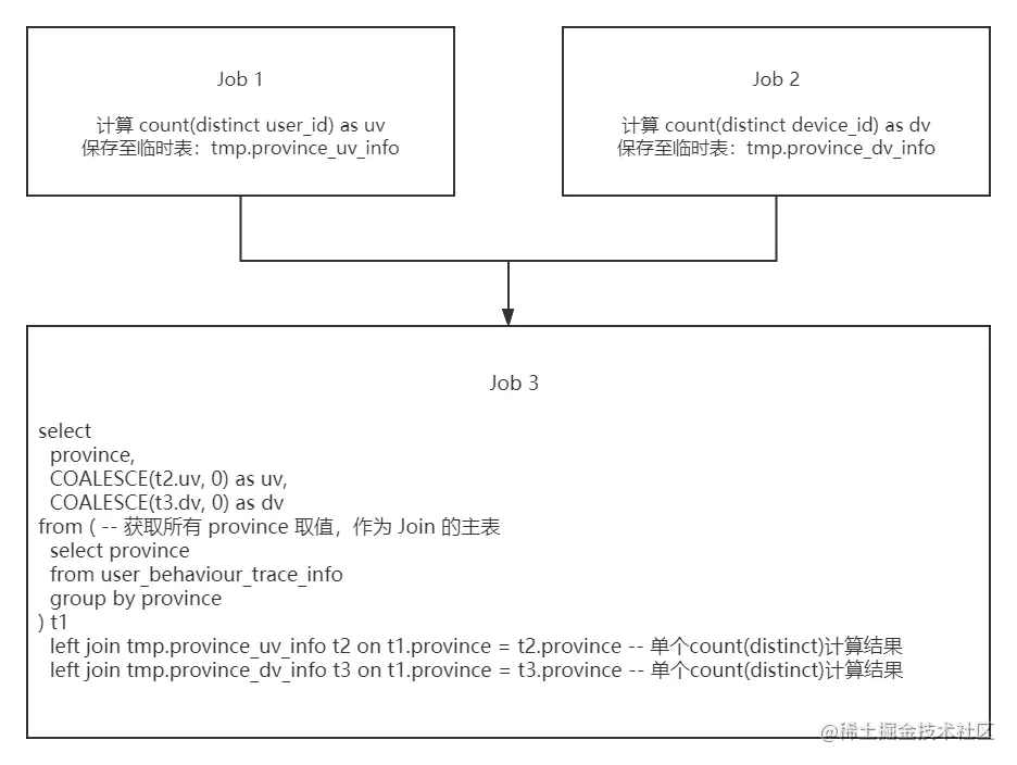在第二步中,我们已经将同一个 province 的 user_id 分成多个部分,并且统计出了每个部分的 user_id 数量(partial_uv)