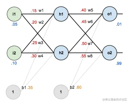对于输入 i1=0.05 和 i2=0.10,我们想让神经网络的输出分别为 o1=0.01 和 o2=0.99