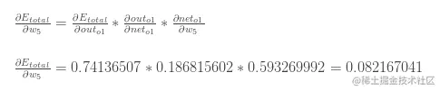 我们把如上计算结果放到一起,得到最终总误差对w5的偏导数: