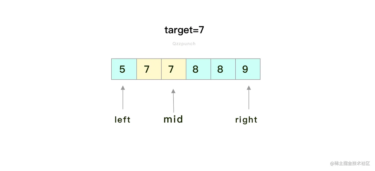 关于什么是二分查找, 我们可以通过一个简单的问题开始:从给定的有序数组nums中,找到目标值的位置。输入nums为[0, 2, 3, 4, 5, 7, 8, 9], 目标值target为7。