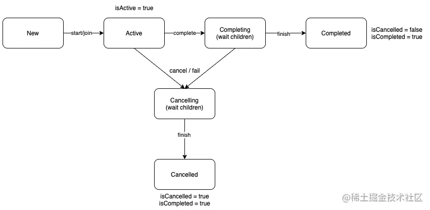 当一个协程创建后它就处于新建(New)状态,当调用Job的start/join方法后协程就处于活跃(Active)状态,这是运行状态,协程运行出错或者调用Job的cancel方法都会将当前协程置为取消中(Cancelling)状态, 处于取消中状态的协程会等所有子协程都完成后才进入取消 (Cancelled)状态,当协程执行完成后或者调用CompletableJob(CompletableJob是Job的一个子接口)的complete方法都会让当前协程进入完成中(Completing)状态, 处于完成中状态的协程会等所有子协程都完成后才进入完成(Completed)状态。