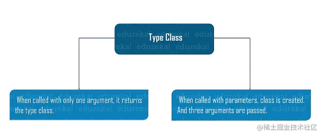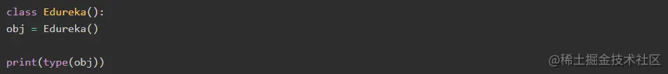 在上面的代码中,我们有一个名为Edureka的类,以及一个关联的对象。我们通过简单地在该类型之后创建一个名为自身的类,创建了一个名为Edureka的新类型。在第二个代码中,当我们检查Edureka类的类型时,其结果为“类型”。
