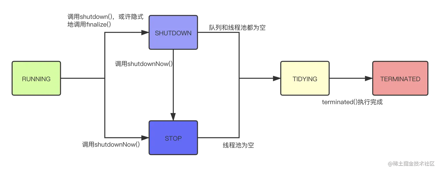 | STOP | 处于STOP状态下的线程池,不再接收新到来的任务,但是依然能够处理阻塞队列中的任务 | |