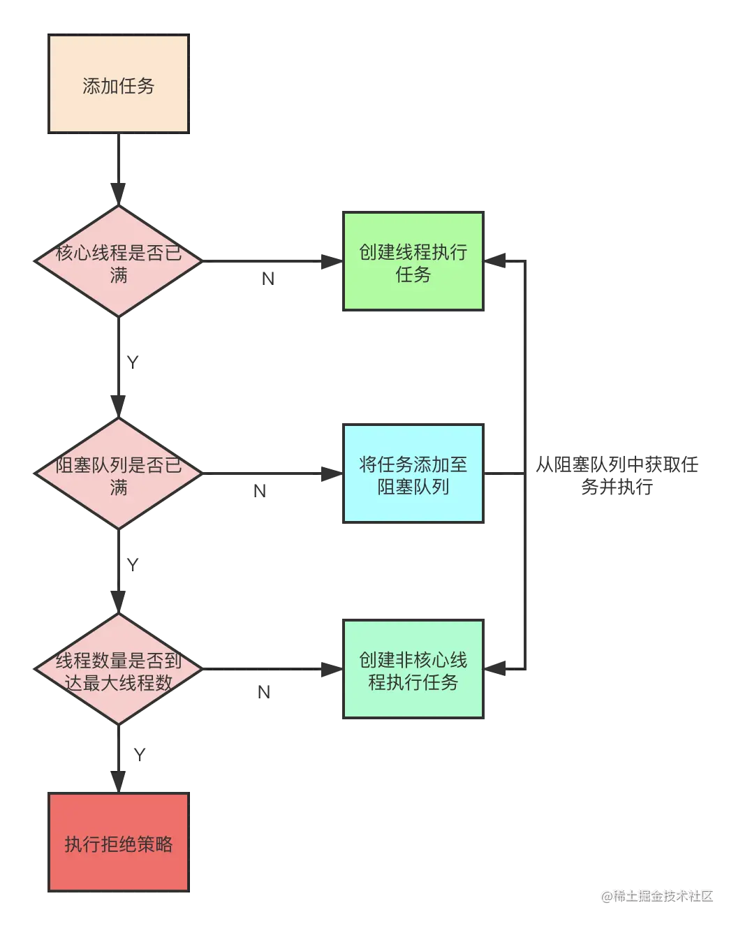 // 工作线程数量 >= corePoolSize && 线程池处于运行状态 => 将任务添加至阻塞队列中