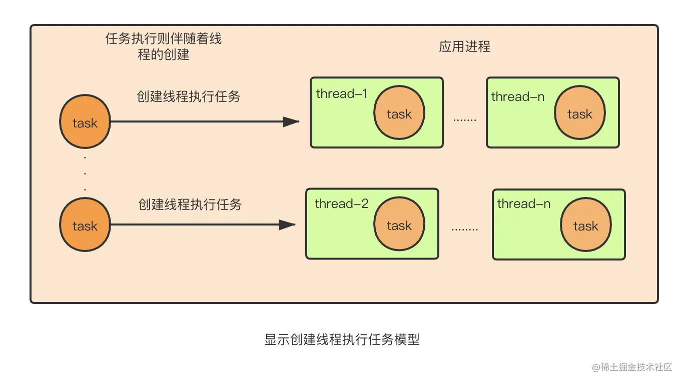 我们先来回忆一下在没有线程池之前创建线程执行任务的模型如下图所示