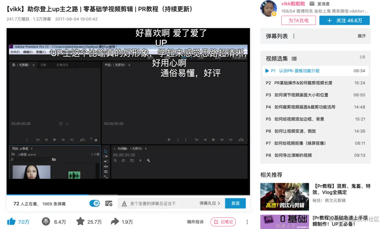 我推荐 vikk 的视频剪辑教学,一共就 8 节课,可以说是寓教于乐,干货满满。