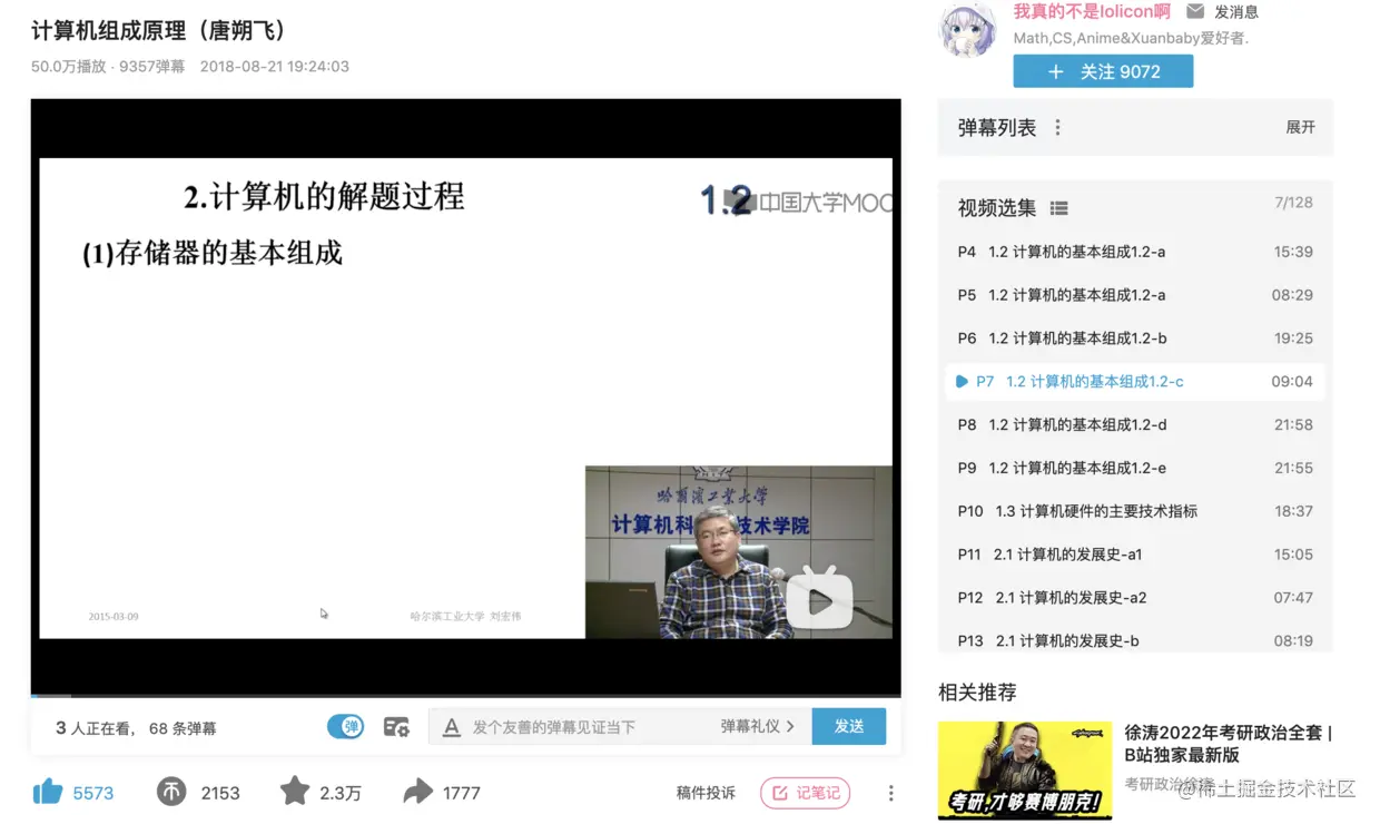 如果想深入学习计算机组成原理的话,我推荐哈工大的这门视频课,整体评价非常高。一共 128 节,每节课差不多 10 分钟左右,建议 1.5 倍速食用。