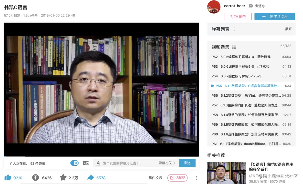 学习 C 语言的话,我推荐浙江大学的翁恺教授的课程,讲得非常棒,我已经是第 3 次推荐了吧。132 小节,每节课差不多 10 分钟,学习起来很轻松。老师背后的书是真的多,有不少是英文原版的,我偷偷地买了好几本,哈哈。