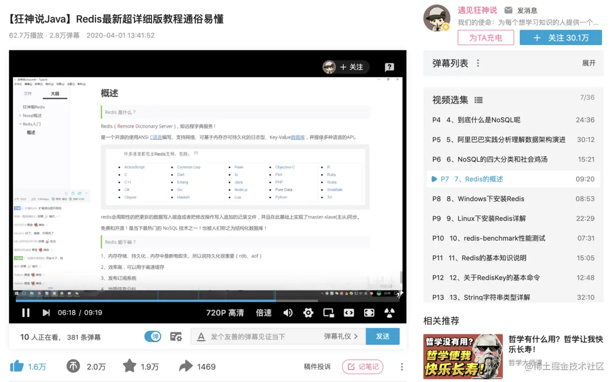 目前大多数公司的存储都是 MySQL + Redis,MySQL 作为主要的存储方式,Redis 作为缓存,用来加快热点数据的读写速度,从而提高性能。所以学完 MySQL,可以趁热打铁学一下 Redis。我推荐狂神说的 Redis 课程,一共 36 小节,每节课差不多 20 分钟