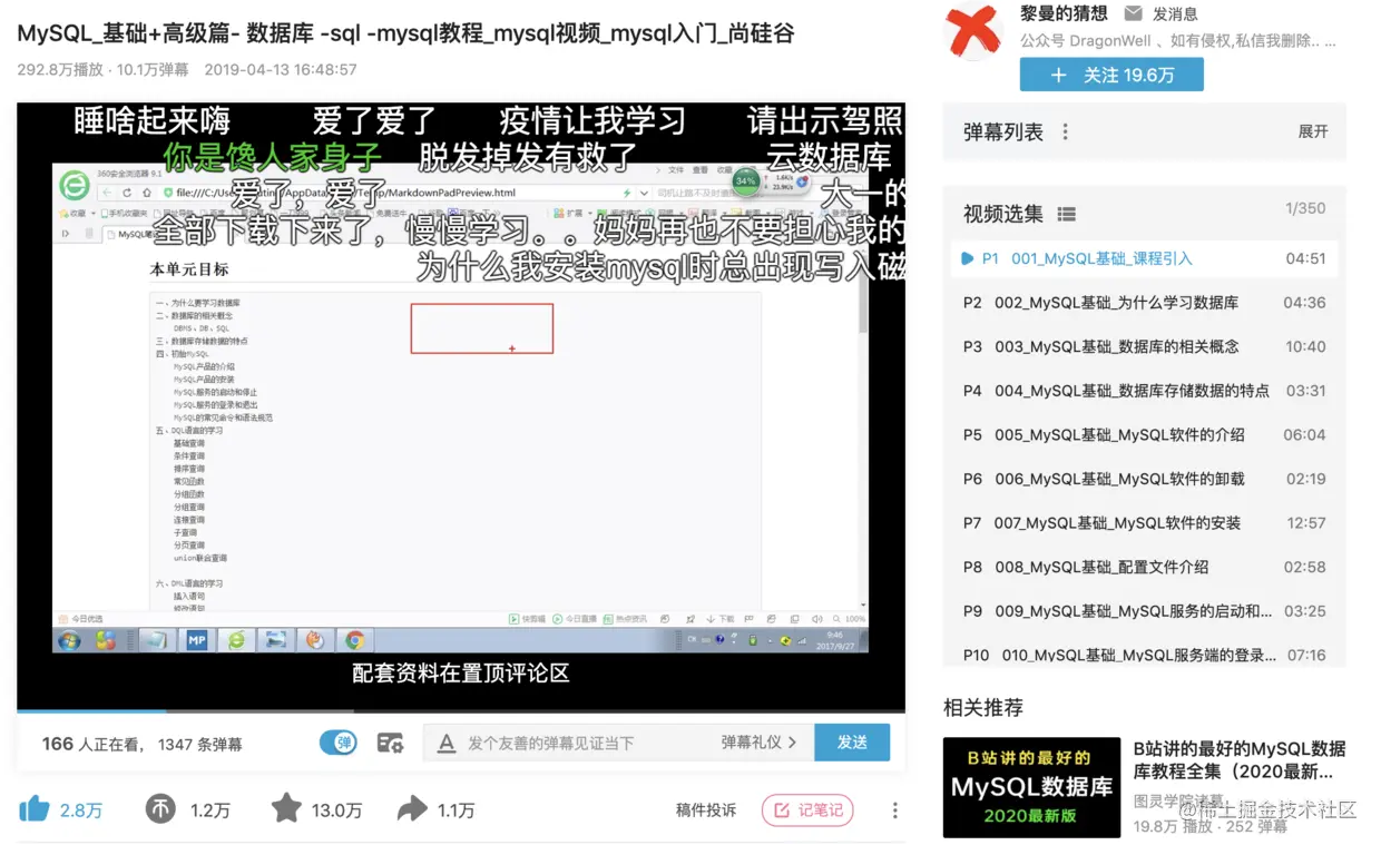 然后再学习一下市场占有率非常高的 MySQL,视频我推荐尚硅谷的一个课程,女老师讲的。不得不承认,老师讲得很精彩,嗯,弹幕里也很精彩。350 集,内容量巨大。