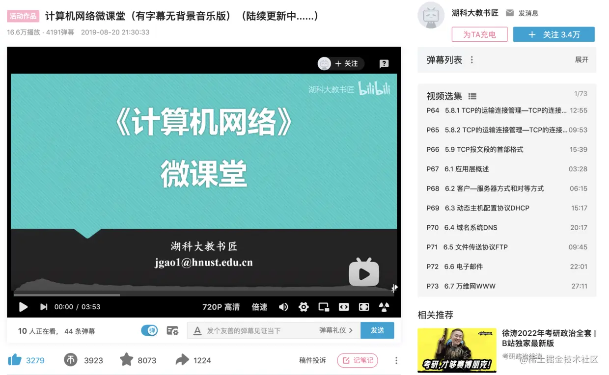 计算机网络方面的视频我推荐湖科大教书匠的《计算机网络微课堂》,制作得非常用心,是一部不可多得的佳作。目前更新了 73 小节,每节 20 分钟左右,很适合在假期刷。
