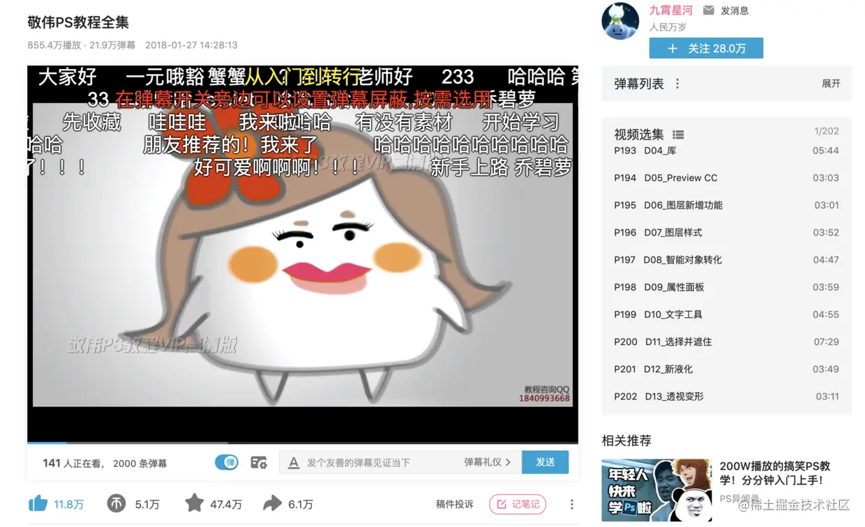 我大学那会是有 PS 这门课的,只不过那时候没有好好学,导致工作后 PS 个背景图了,或者搞个二维码了,还得找人 PS,很麻烦。想学 PS 的话,我推荐《敬伟 PS 教程全集》,202 集,制作非常精良。