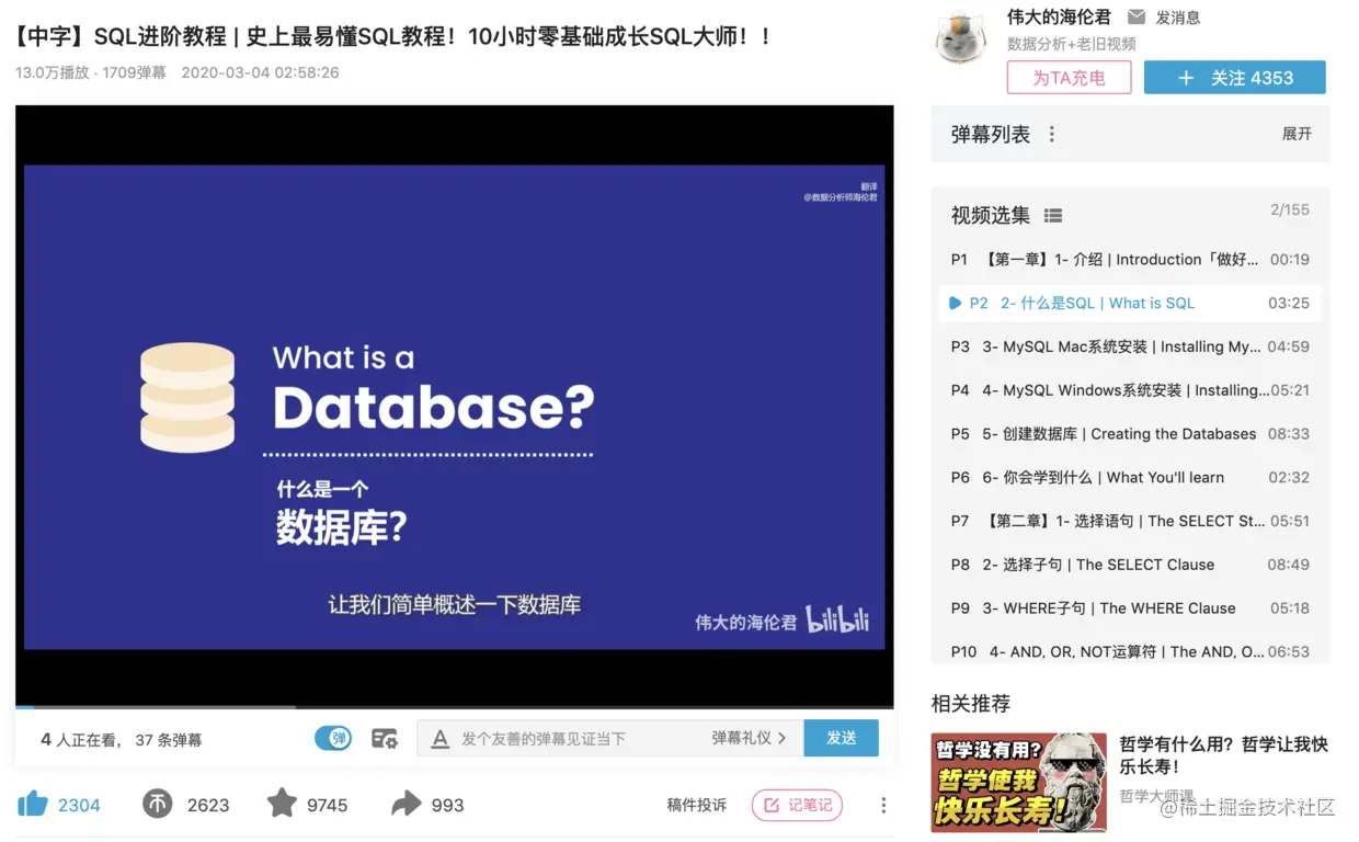 要想学好数据,首先要学习一下 SQL,我推荐一个老外的视频课(中字版啦),内容制作得非常棒,所以完全不用担心听不懂。155 小节,但每节课大概只有 1 分钟或者 5 分钟的长度,真 10 个小时就能学完。