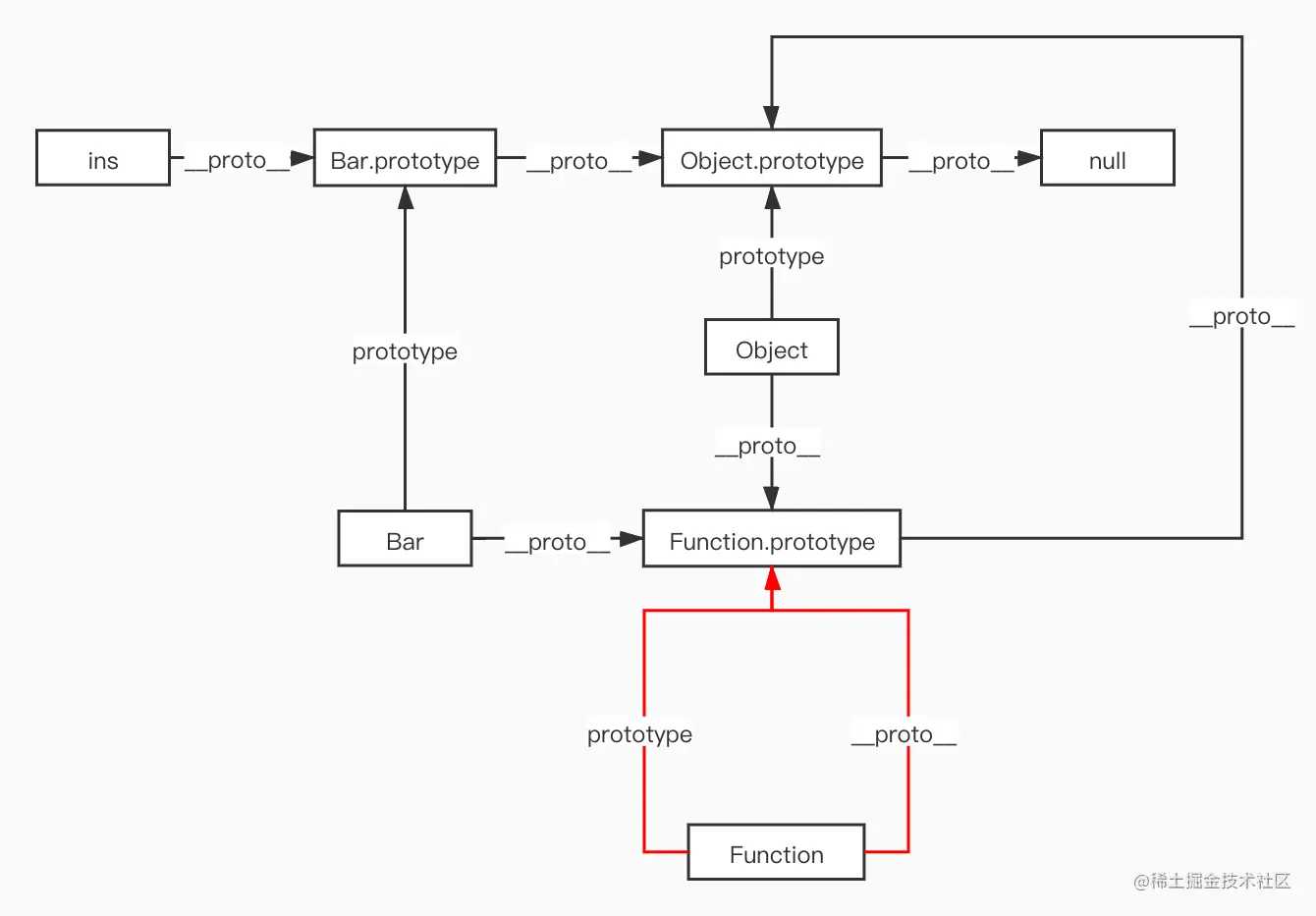 Function和Function.prototype之间的关系。一般函数的prototype和__proto__会指向两个不同的对象,而Function的prototype和__proto__均指向了Function.prototype,这就导致了Function和Object之间形成了某种“循环”,Function instanceof Function就像是自己创造了自己。