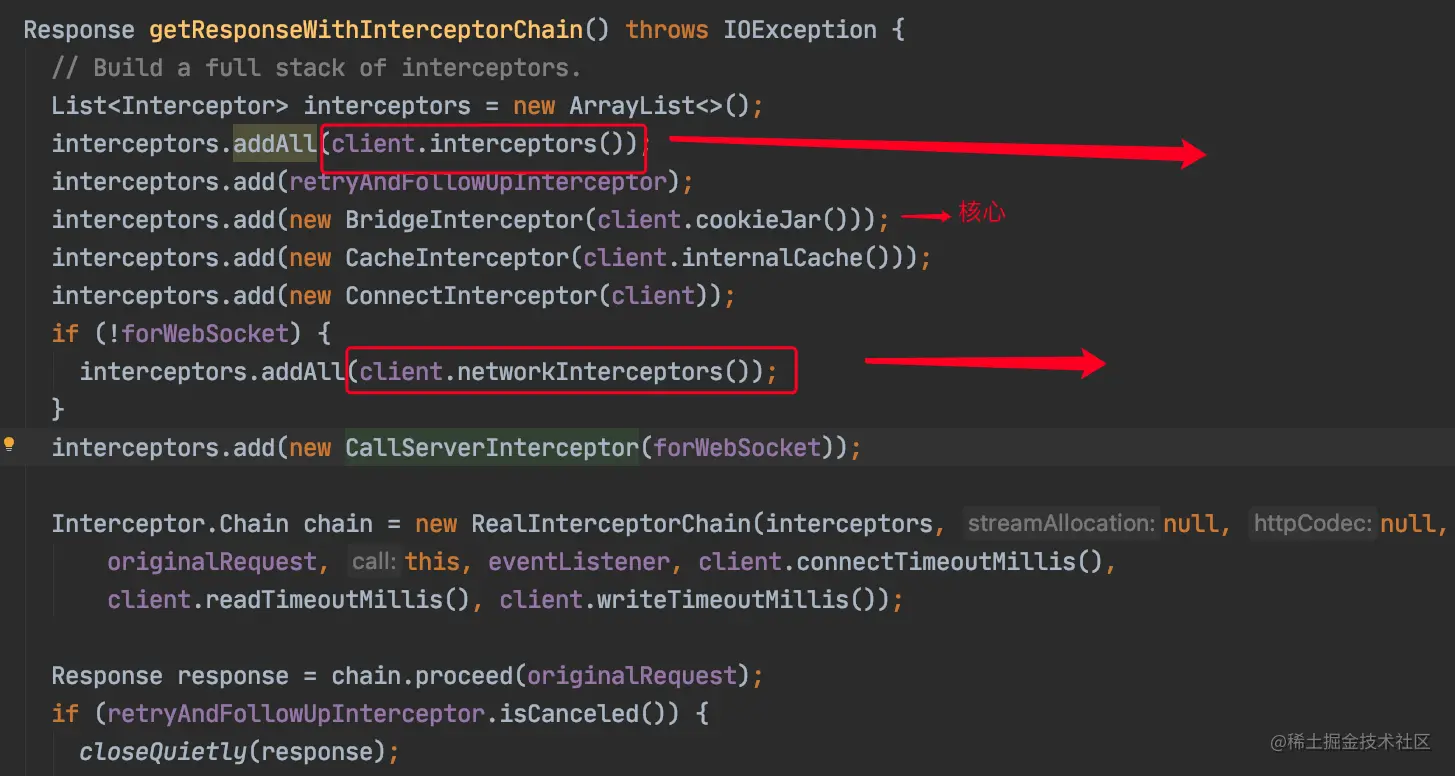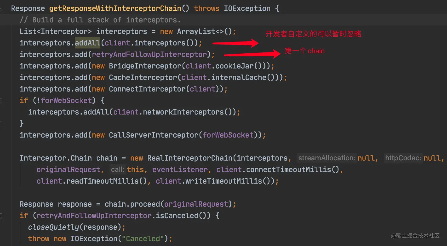 整个请求的发出 包括 结果的返回其实都是在这个 getResponseWithInterceptorChain 方法中